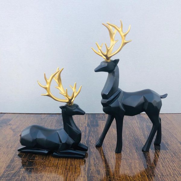 Captivating Pair of Deer Statue, featuring majestic golden horns that beautifully contrast against the sleek black base. These exquisite sculptures exude a harmonious blend of elegance and grace.