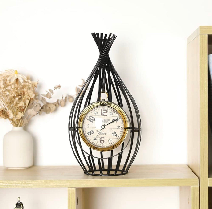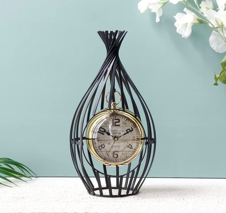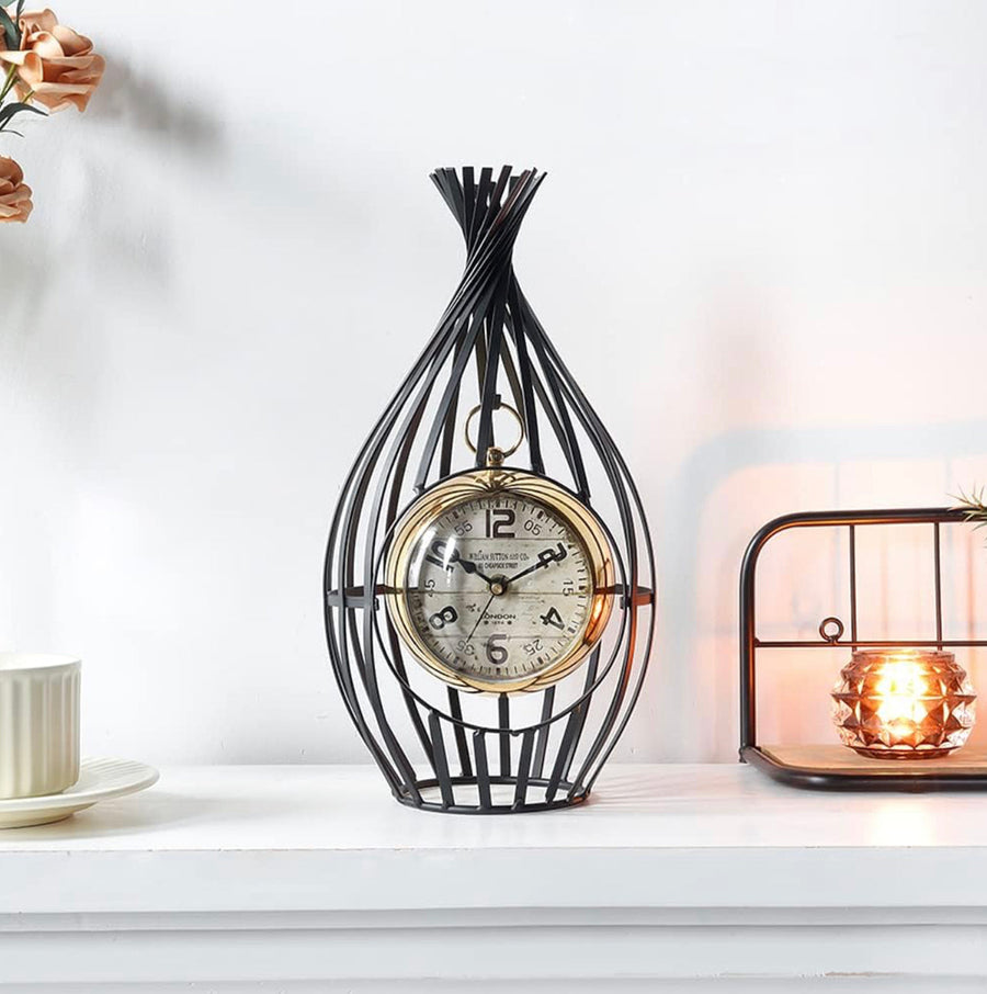 Black Cage Gold Hanging Table Clocks are often used as a decorative pieces in homes or offices, adding a touch of elegance to any interior decor.