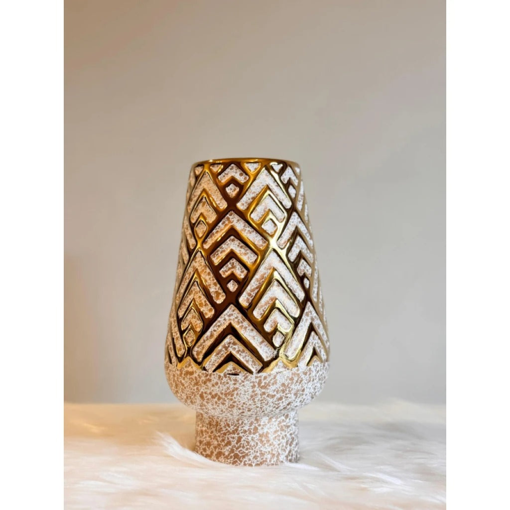 Intricate Egypt-inspired gold pattern along the vase.