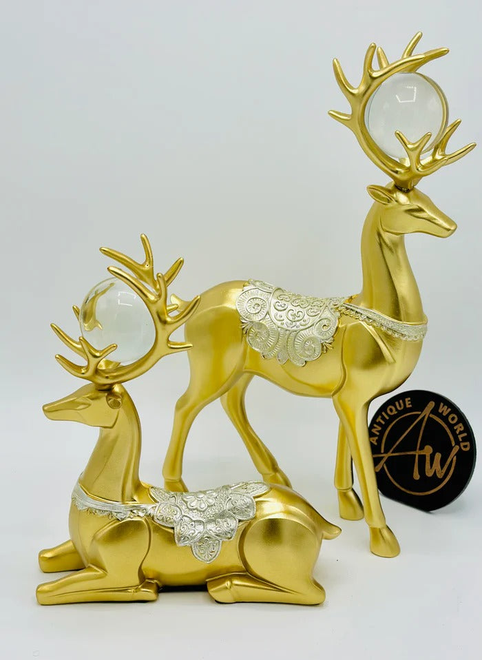 Capture the enchanting beauty of nature with our exquisite pair of deer sculptures. Crafted with meticulous detail, one deer stands majestically while the other sits gracefully. Adorned with delicate glass balls on their magnificent horns, they exude elegance and mystique. A stunning display that brings a touch of wilderness and serenity to your space.