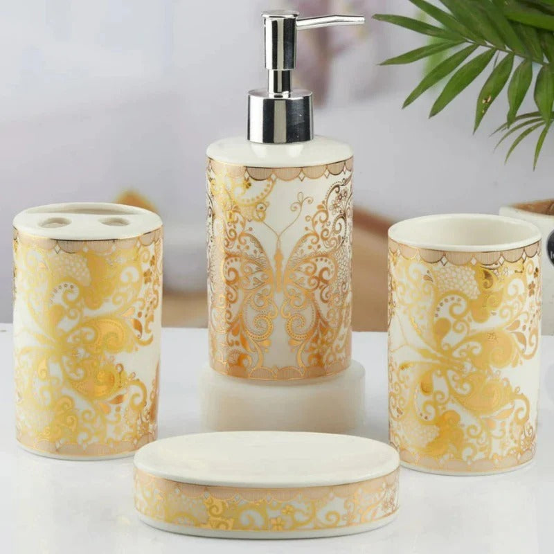 1 Soap dispenser , 1 Tumbler , 1 Soap dish, 1 Brush holder