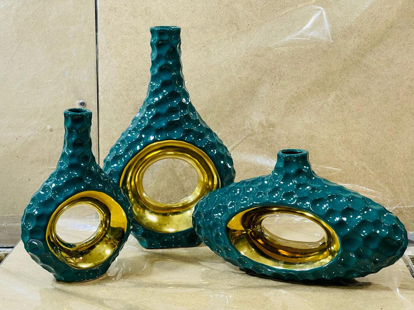 Introduce a touch of luxury and natural beauty to your decor with our 3-piece Green Golden Vase Set, designated Meticulously crafted, this ensemble seamlessly blends lush green tones with rich golden accents, creating a sophisticated collection.