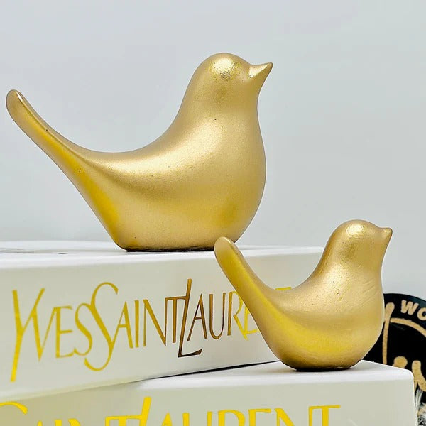 Enjoy a timeless piece of decor with the Jane & Joe Sparrows Statue. Crafted with resin and coated in a gleaming gold finish, this pair of sparrow statues brings a touch of elegance to your tabletop. Perfect for adding a touch of flight to your decor, this Statue can also be used as a paperweight.