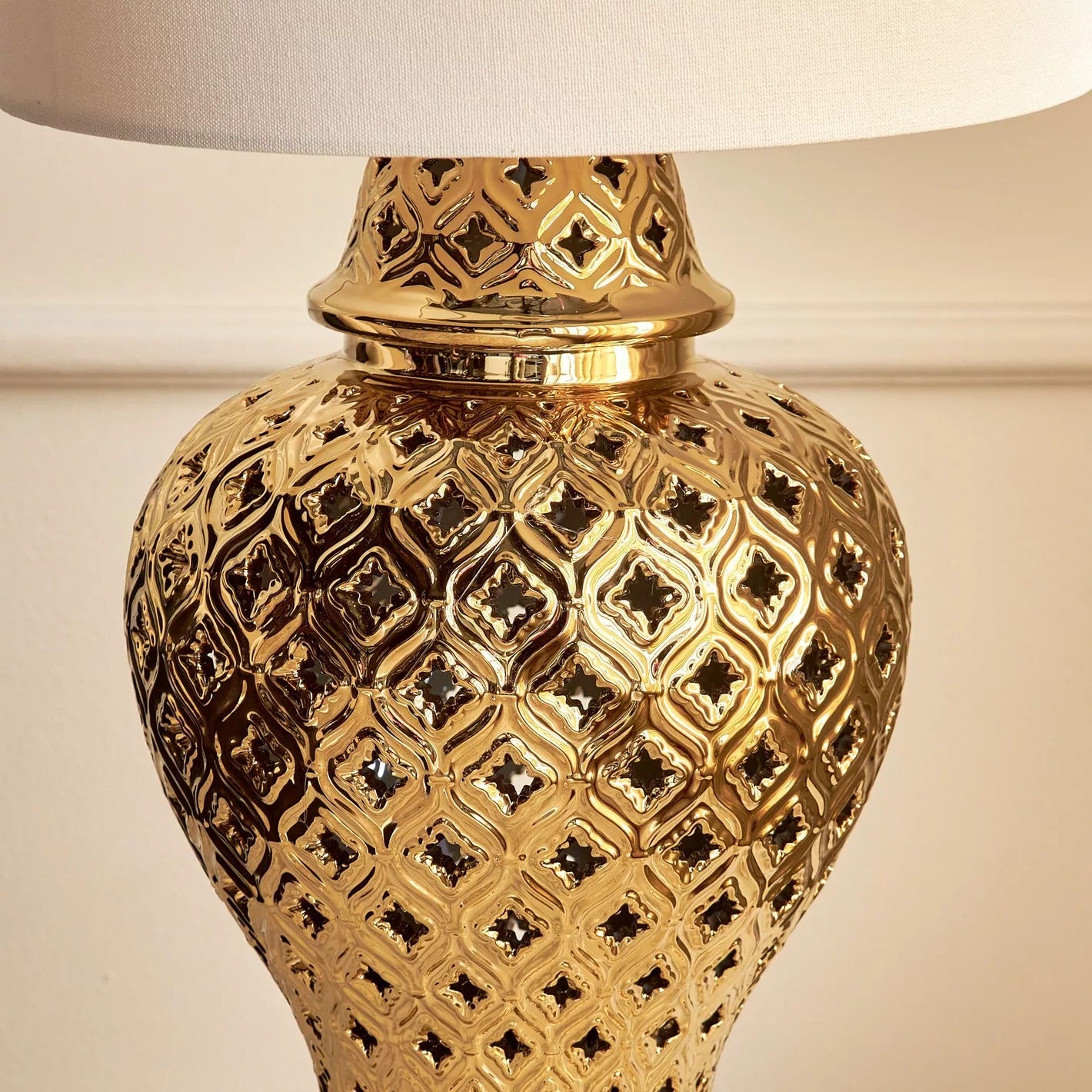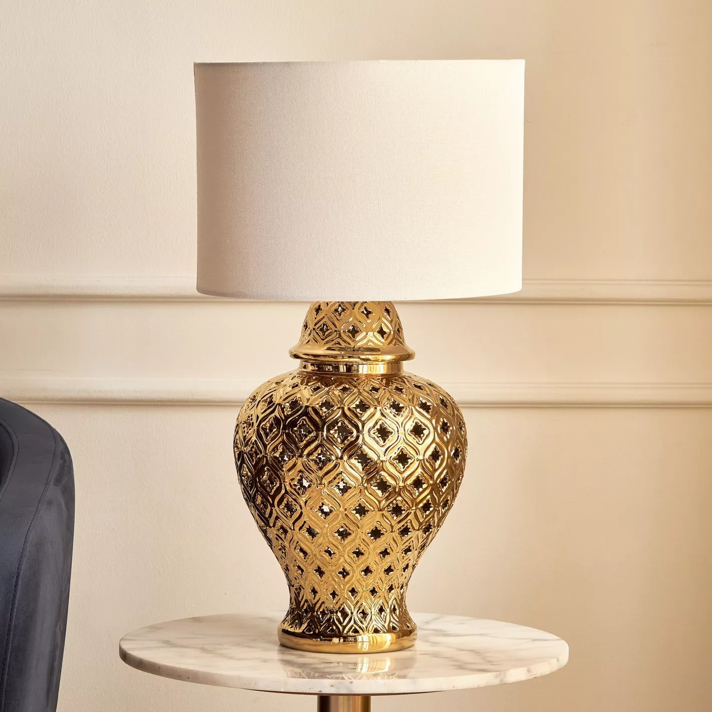 This table lamp is a delightful pick for modish interiors. The base is made from ceramic with a textured finish and radiant metallic