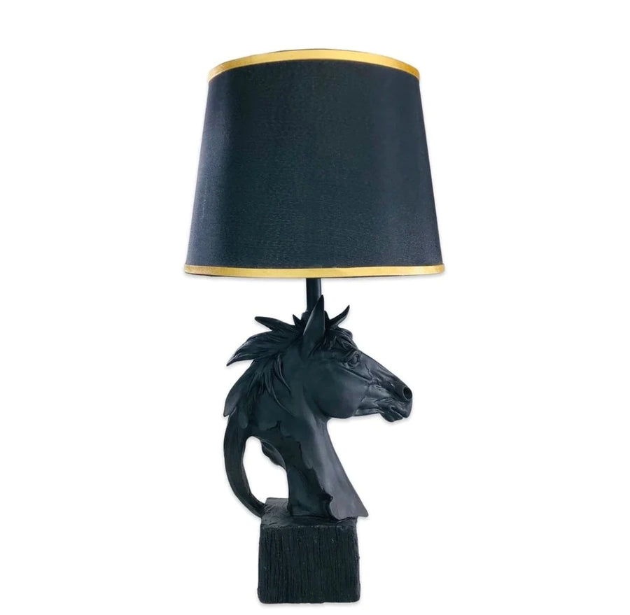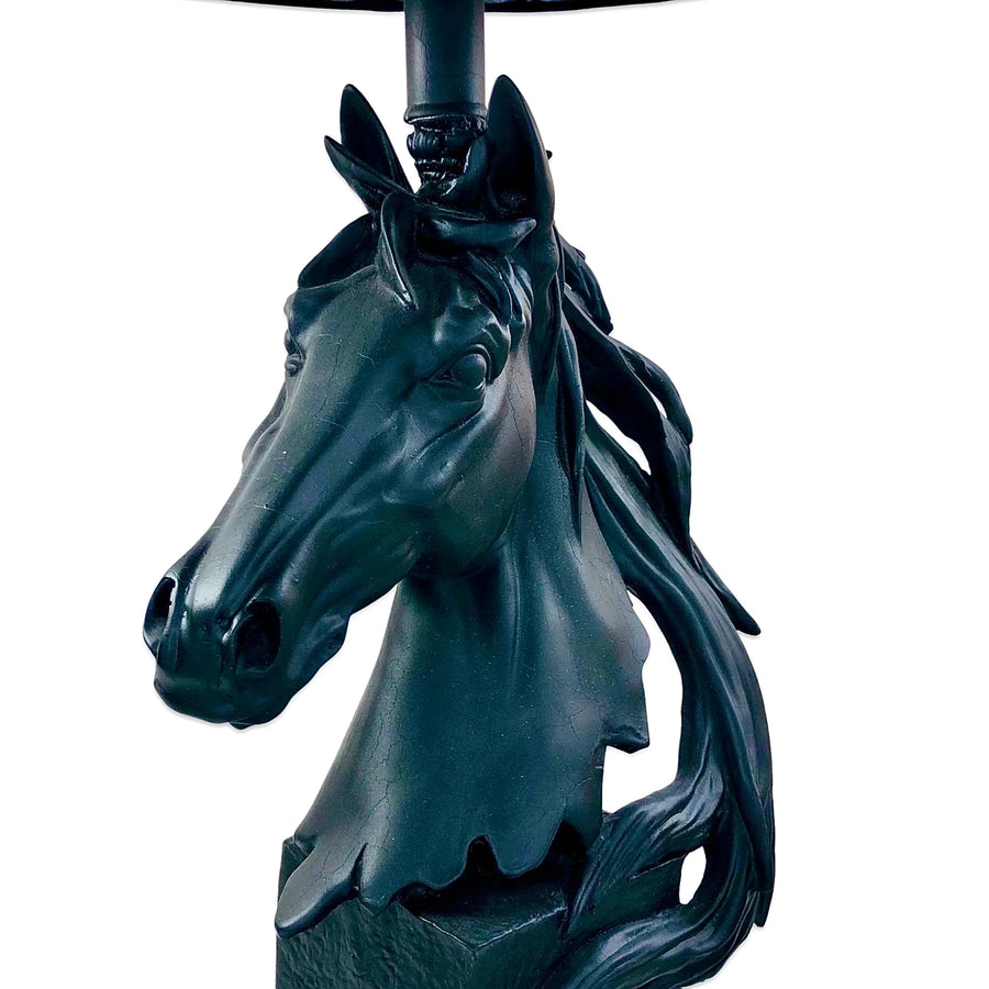 our Matt Black Stallion Horse Lamp. The sleek, black table lamp boasts an intricately detailed stallion horse face, expertly crafted to give your home a unique flair. The classic round shade completes the look, adding a polished finish to the perfect piece of decor.