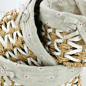Basket 95% wicker, 5% jute. Fabric lining 60% cotton, 40% polyester