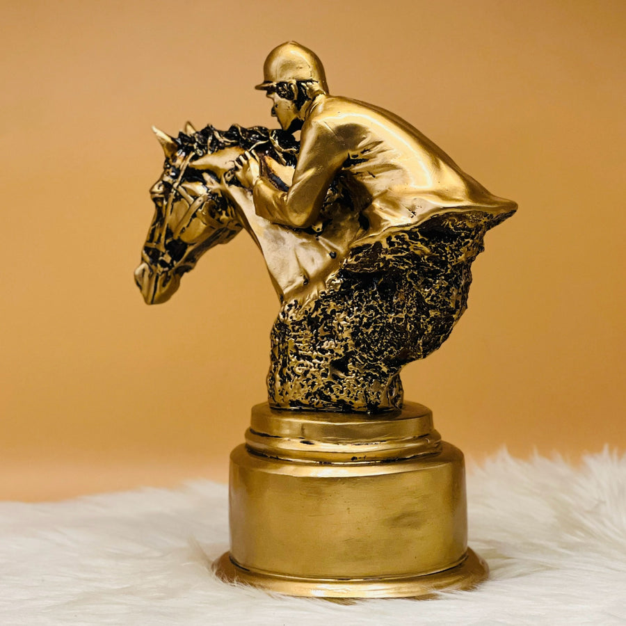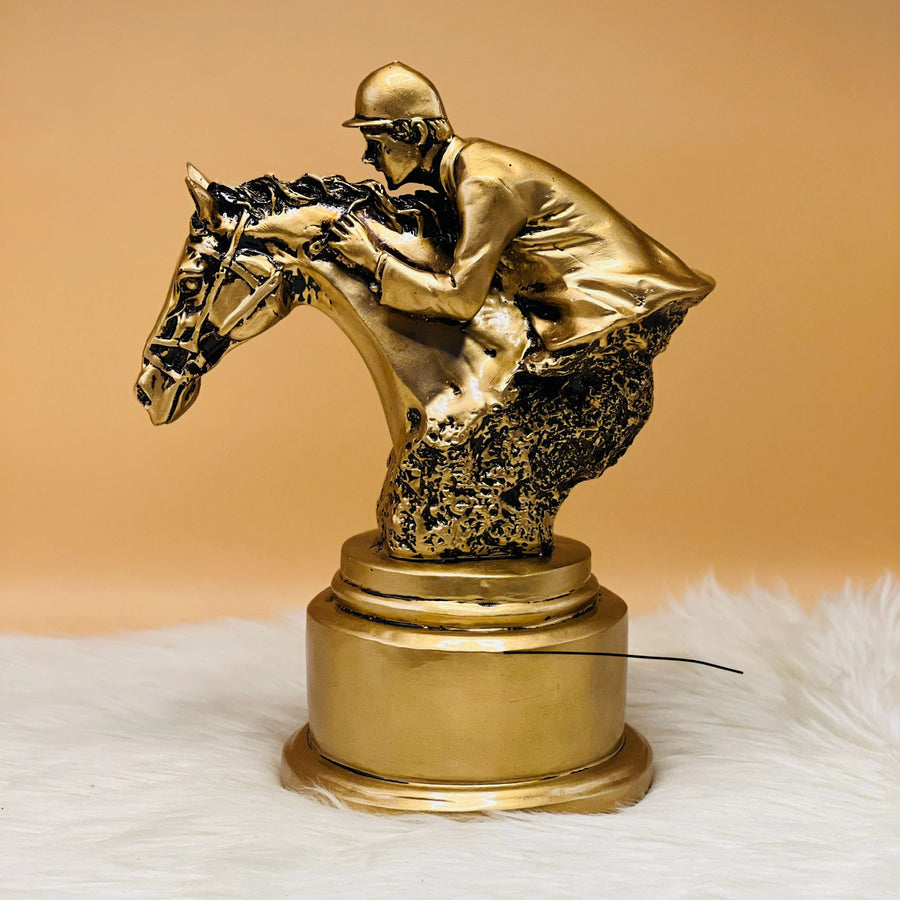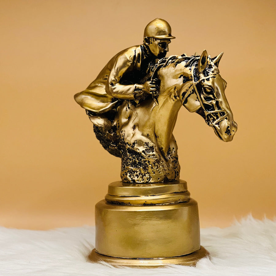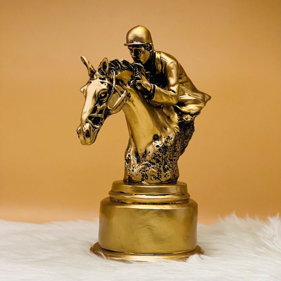 Embrace the spirit of competition with our Bronze Equestrian Race Horse and Jockey Rider Sculpture. This exquisite piece captures the dynamism of a race, showcasing intricate craftsmanship. A stunning addition, blending elegance and the thrill of the track."