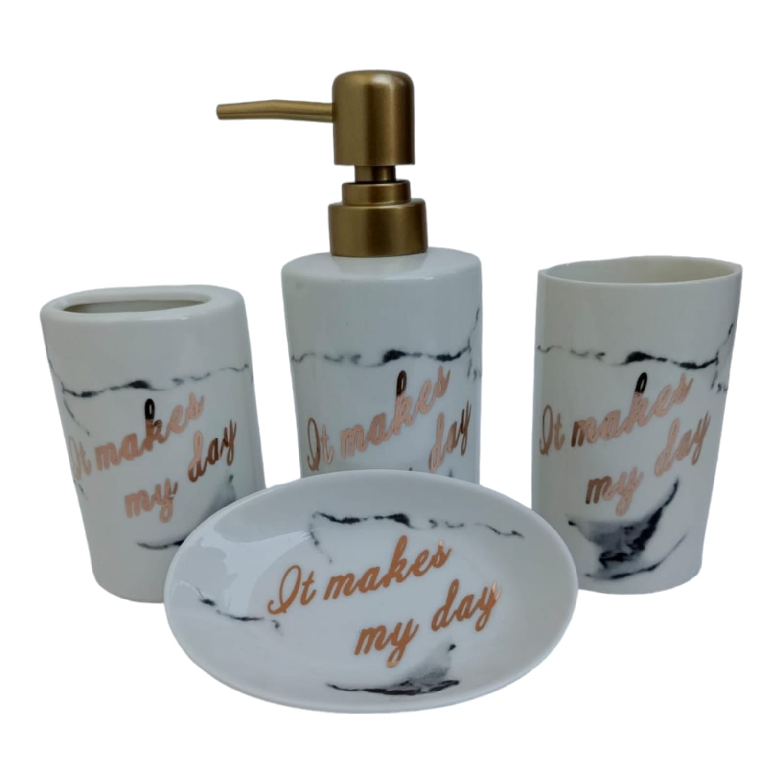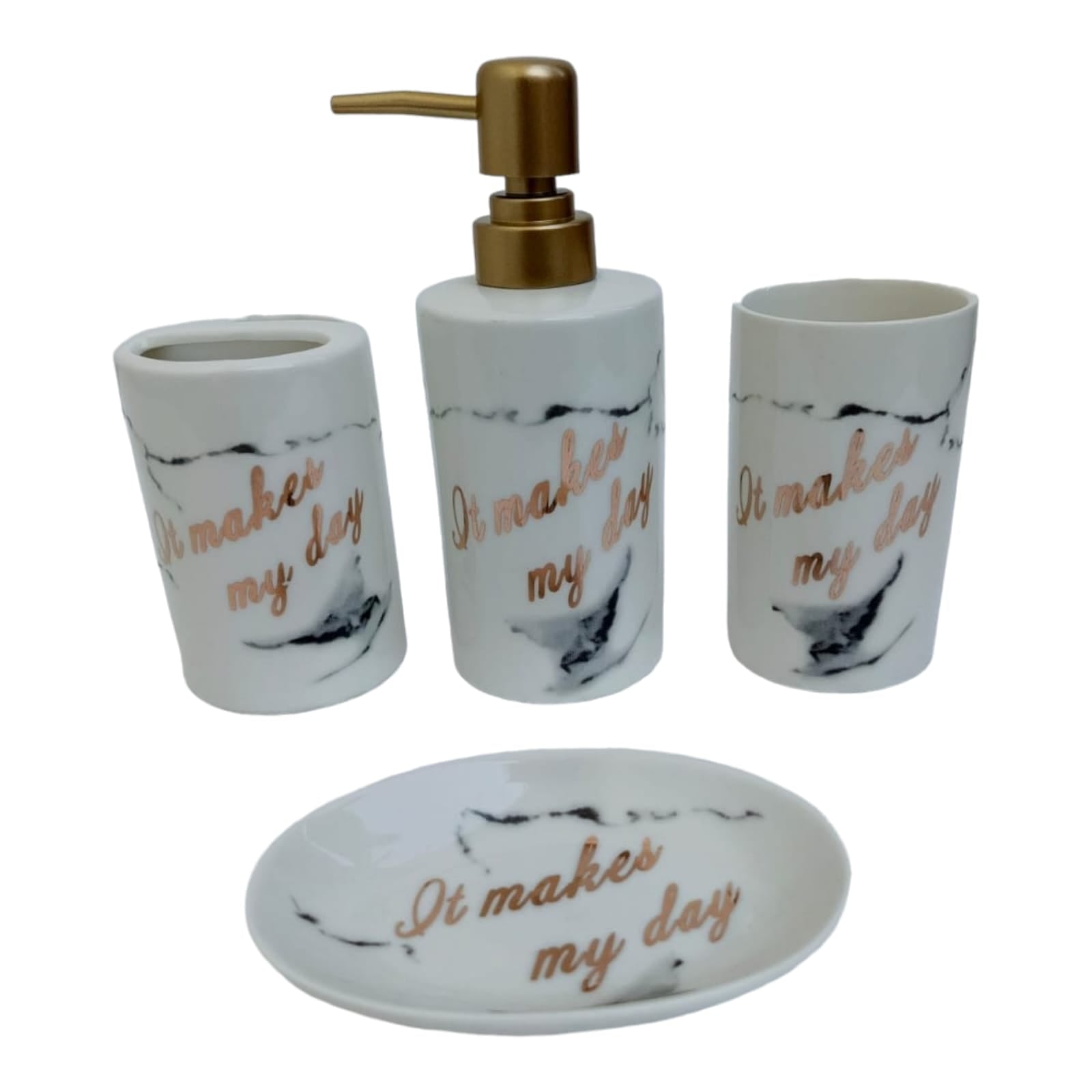 1 Soap dispenser , 1 Tumbler , 1 Soap dish, 1 Brush holder