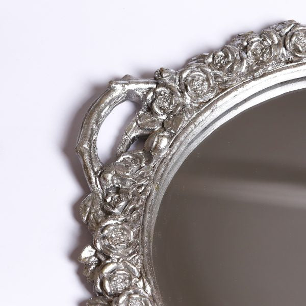 The Silver Halo Vanity Tray is a beautifully crafted round tray featuring an intricate floral design. Perfect for both serving and display, this elegant tray’s silver color provides a neutral accent that complements any setting.