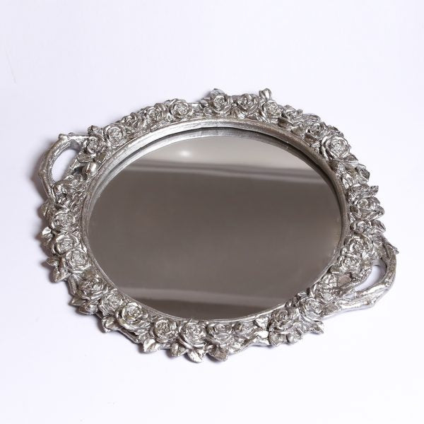 Enhance your home with its timeless beauty and functionality. Round shape with floral crafted design Ideal for serving and display Neutral silver color complements any setting